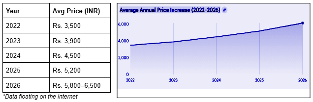 - Approximately 75.7% increase in price from 2022 to March 2026.